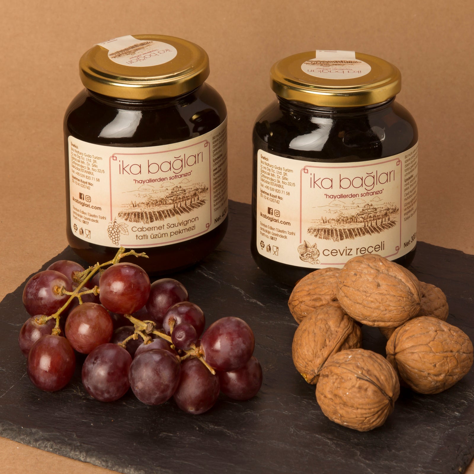 Çiftliğimizin başlıca ürünlerinden olan leziz Cabernet Sauvignon üzümlerimizi ve Chandler cevizlerimizi sizlerle buluşturmak için, ailemizle birlikte geliştirdiğimiz tarif ve deneyimimizi mahsullerin lezzeti ve meşe odunu ateşiyle bir araya getirerek tadı unutulmayacak bir üzüm pekmezi ve ceviz reçeli yarattık. Sofralarınızı renklendireceğine ve enerjinize enerji katacağına inandığımız pekmez ve reçelimizin müdavimi olacaksınız.