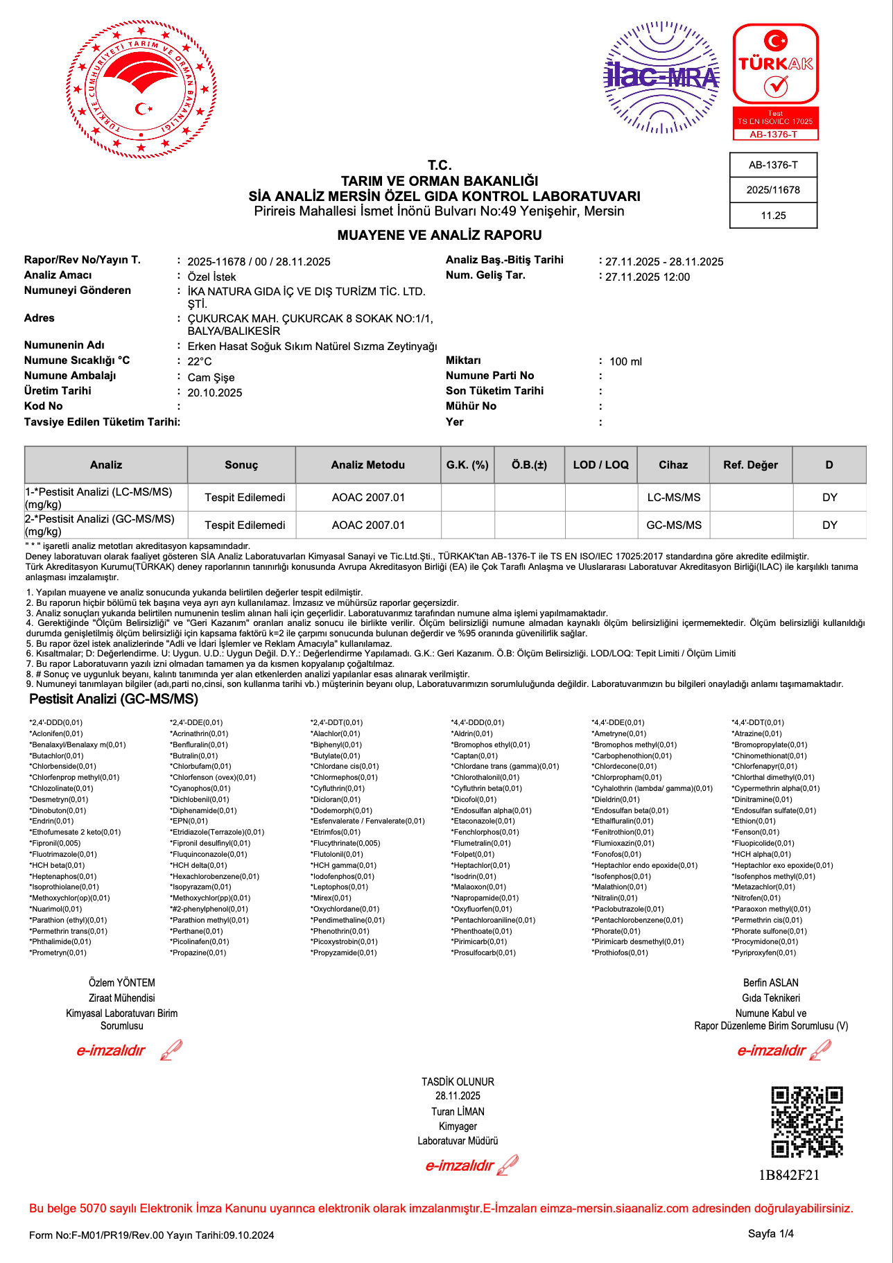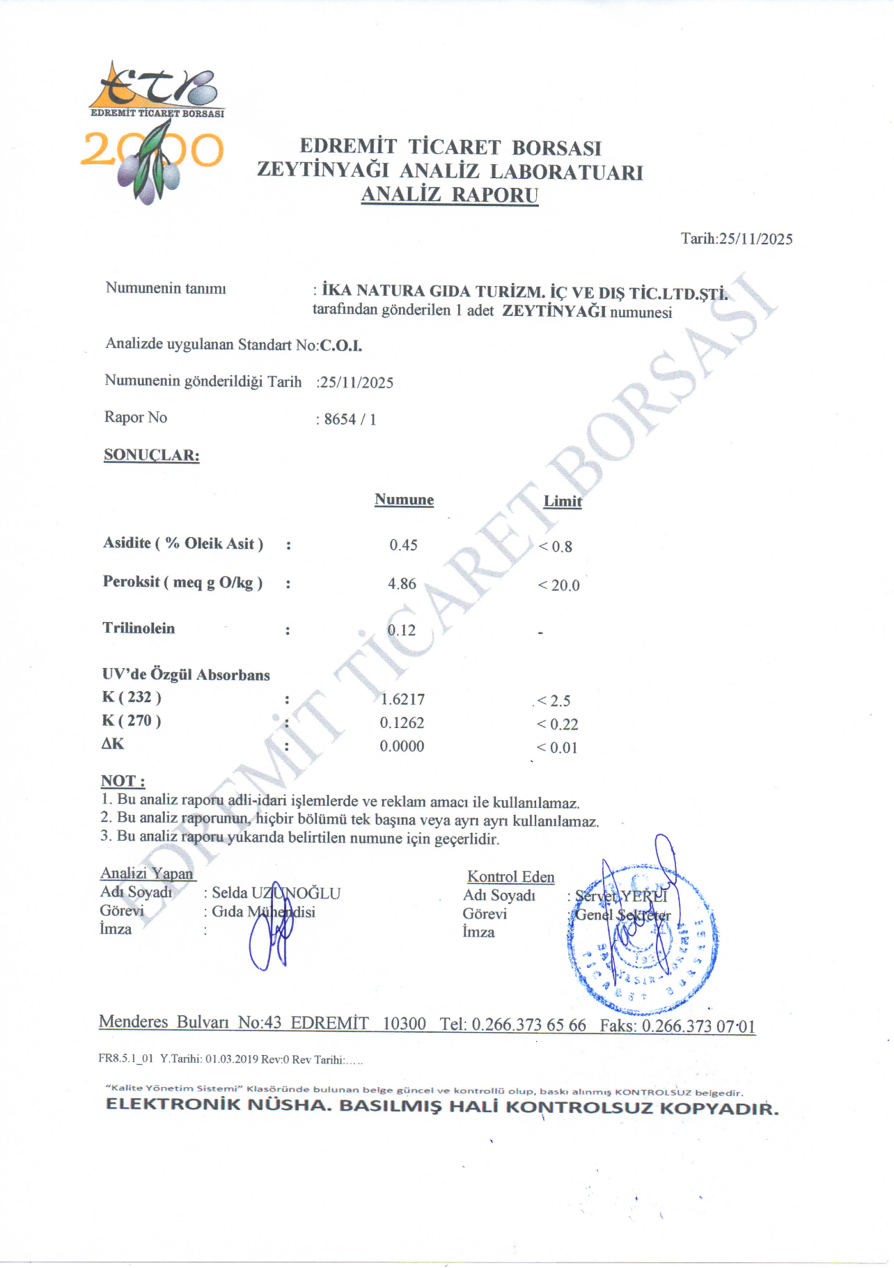 Zeytinyağımızın güncel pestisit (tarım ilacı) analiz raporuna ulaşmak için tıklayın.